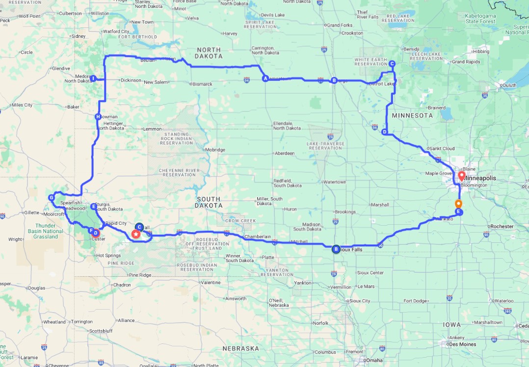 Färden fortsätter sedan genom det vilda västern – förbi mytomspunna Devils Tower, vidare in i buffelfyllda Theodore Roosevelt National Park, och slutligen österut genom North Dakotas småstäder och Minnesotas sjölandskap.